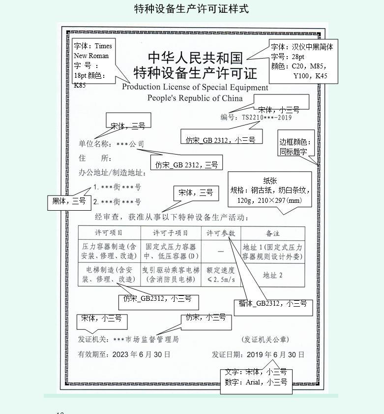 9.樣式中,標(biāo)注顏色的為紙質(zhì)許可證上預(yù)先印制的;只標(biāo)注字體和字號(hào),未標(biāo)注字顏色的為計(jì)算機(jī)打印(黑色)的。